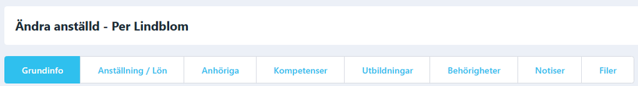 När du klickar på pennan för en anställd kommer du till ett formulär med flikar för olika uppgifter. Mycket av informationen är valfri att fylla i men hjälper till att hålla koll på kostnader, kontaktvägar och kompetenser. Har du en koppling till t.ex. Fortnox kan din personal hämtas över med ett klick.