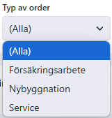 Använd filtret för att visa projekt med en viss arbetsordertyp – till exempel Nybyggnation eller Servicejobb.