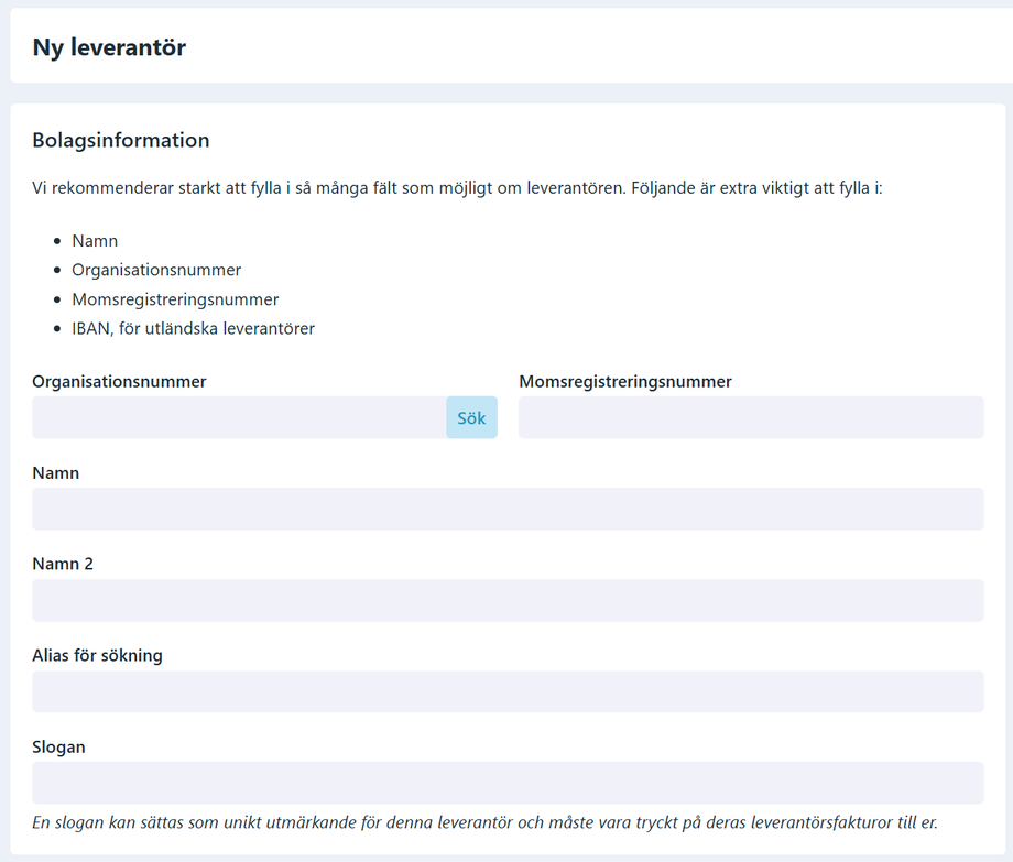När du skapar en leverantör kan du fylla i all relevant information för att optimera flödet med leverantörsfakturor och automatiska tolkningar. Genom att ha en komplett profil för varje leverantör blir det enklare att hantera fakturor och kommunikation.