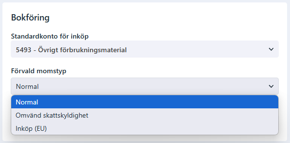 För att bokföring ska fungera behöver ett standardkonto för inköp vara valt i dina bokföringsinställningar