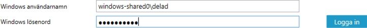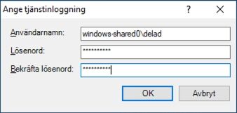 Följ sedan anvisningarna och klicka på "Nästa" tills rutan "Ange tjänsteinloggning" dyker upp. Då anger du användarnamnet som tidigare fråga "whoami" svarades på i kommandotolken - exempelvis "windows-shared0\delad" - och sedan kontots lösenord två gånger.