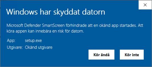 Dubbelklicka på filen setup.exe för att påbörja installationen. Om Windows Defender Smartscreen förhindrar att okänd app startas klickar du på "Mer information" och sedan knappen "Kör ändå".