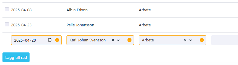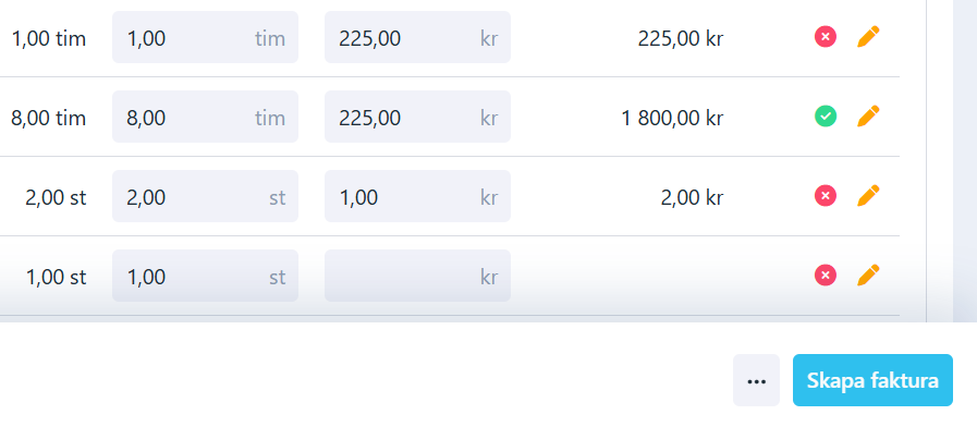 Du kan göra manuella justeringar på både tid, produkter, inköp och utlägg direkt i denna vy.