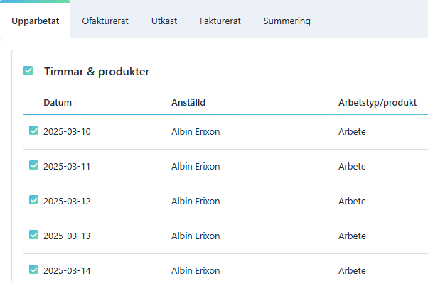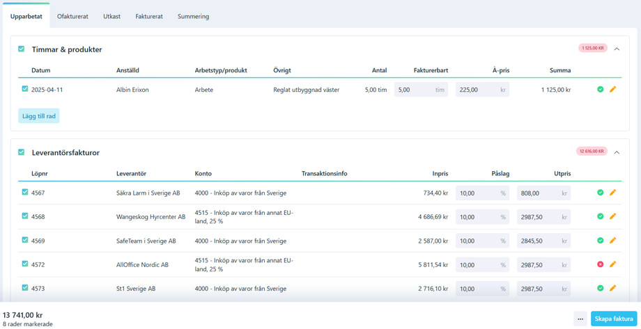 Fliken Upparbetat ger dig en bra överblick över vilka poster som finns att fakturera, vad som är attesterat, vilka utlägg som är godkända och vilka påslag och priser som är satta. Du kan ändra och justera posterna direkt i vyn eller på löneunderlaget genom att klicka på pennan.
