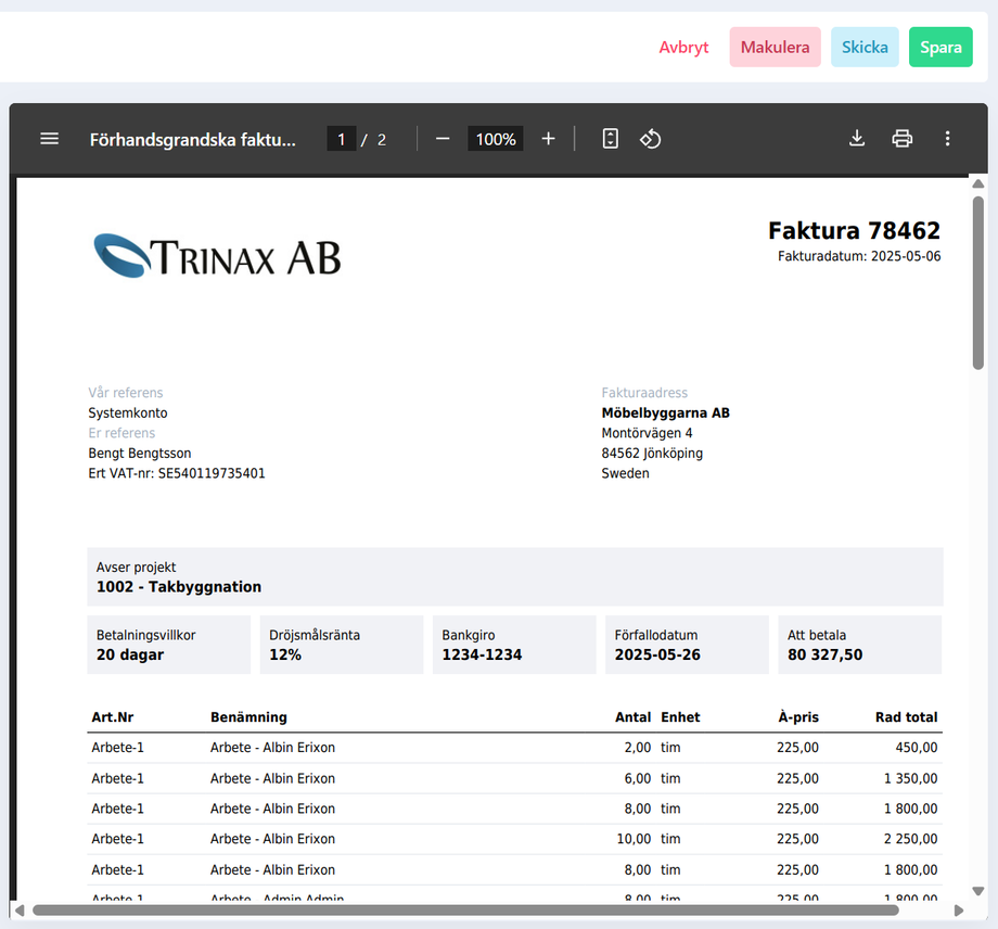 Därefter kommer du till fakturavyn och kan välja att fortsatt justera dina importerade poster eller välja att skicka iväg den.