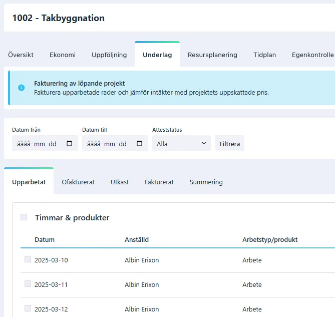 I ett projekt som är satt till Löpande i prissättningen, hittar du allt fakturerbart inne på ditt projekt under fliken Underlag och därefter fliken Upparbetat. Här delas underlagen upp i: