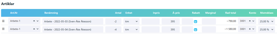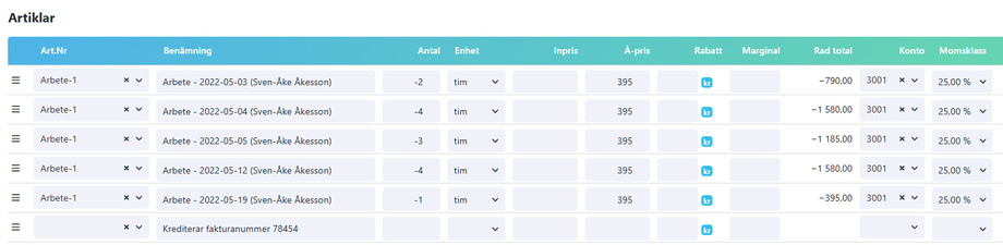➜ då räknar systemet ut en negativ radsumma (vilket vi vill ha i en kreditfaktura)