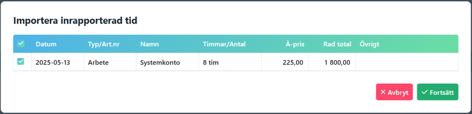 Därefter blir rutan blå och det är nu möjligt att importera valda poster till fakturan (som visas på bilden nedan).