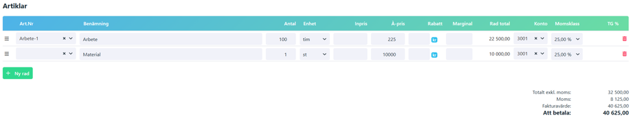 Du kan snabbt och enkelt lägga till de poster som ska vara med på fakturan genom att lägga till nya rader under Artiklar.