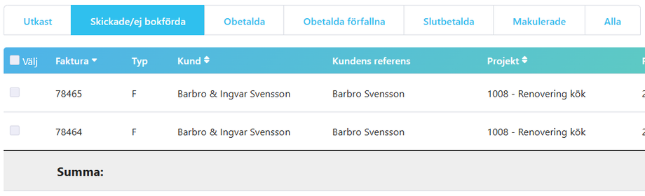 Efter att du klickat på Skicka flyttas fakturan från statusen Utkast till Skickade/ej bokförda.