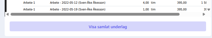 För att se hur fakturan kommer att se ut i sin helhet med bifogade PDFer som du valt under fliken Dokument och bilagor klickar du på knappen Visa samlat underlag. Bilder och andra format på bilagor visas inte även om de bockats i att skickas till kund.