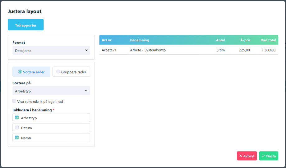Tips! Du kan hämta upp dina arbetstyper och produkter som du skapat om du angett ett artikelnummer på dem. Då hjälper systemet till att även fylla i övrig information från den artikeln, t.ex. enhet och utpris. Mindre manuell inmatning helt enkelt.
