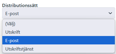 Beroende på vilket val du har gjort under fältet Distributionssätt (på kundkortet kan du välja standardsätt för just den kunden) får du olika val på knapparna Skicka eller Skriv ut uppe till höger när det är dags att få iväg fakturan.