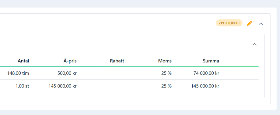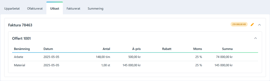 Du kan klicka på pennan för att öppna valt utkast i fakturavyn. Här kan du precis som vanligt arbeta vidare med fakturan, justera innehållet, och skicka eller makulera den. Om du makulerar en faktura flyttas alla rader tillbaka till sin ursprungliga flik, t.ex. Upparbetat och utkastet tas bort.