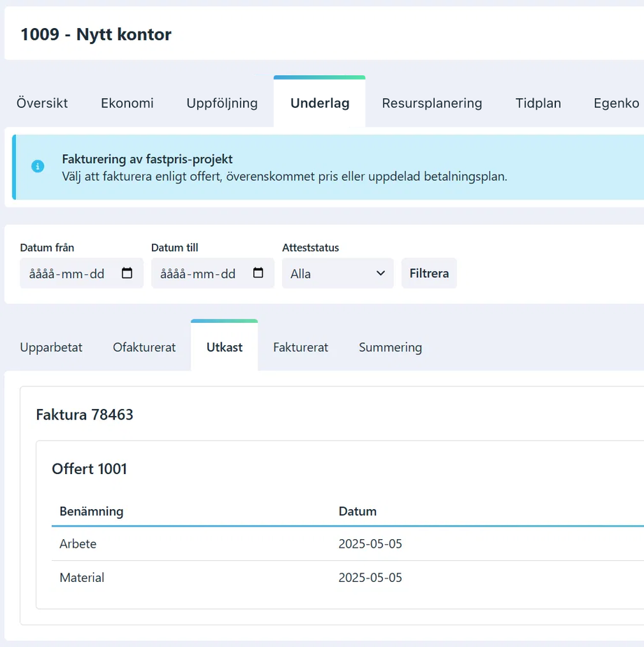 Fliken Utkast är din tillfälliga parkeringsplats för fakturor du har börjat på men inte skickat än. Här samlas allt du förberett – utan att det påverkar projektets ekonomi förrän du faktiskt klickar på skicka.