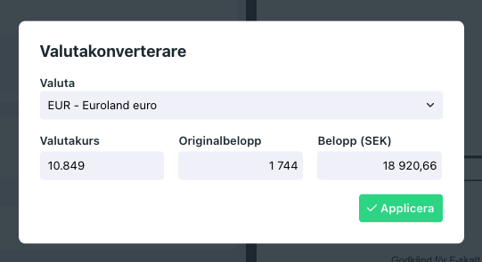 3. I valutakonverteraren väljer du rätt valuta, t.ex. "EUR" och klickar "Applicera"
