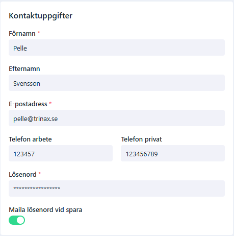 När du klickar på Spara skickas ett mail till den anställde med inloggningsuppgifter till Trinax Tid & Projekt med en uppmaning att byta det nuvarande lösenordet efter inloggning.
