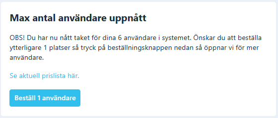 Du kan enkelt se du hur många användare du har just nu och hur många som ingår i din licens, t.ex. "Du har nu 6 av 20 användare".