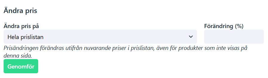 - Välj om prisändringen ska gälla hela prislistan eller en specifik kategori.