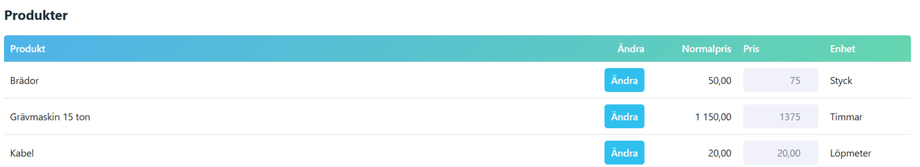 - Du kan ange ett specifikt pris för varje produkt, exempelvis "Brädor", "Skruv" eller "Kabel".