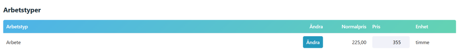- Varje arbetstyp har ett fält för pris som du kan justera för att anpassa till olika kunder eller situationer.