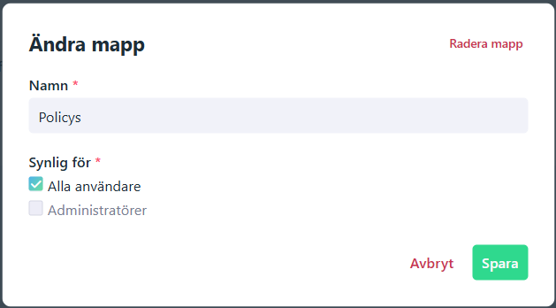 Via knappen Ändra mapp kan du ställa in om mappen ska vara tillgänglig för alla eller endast för administratörer.