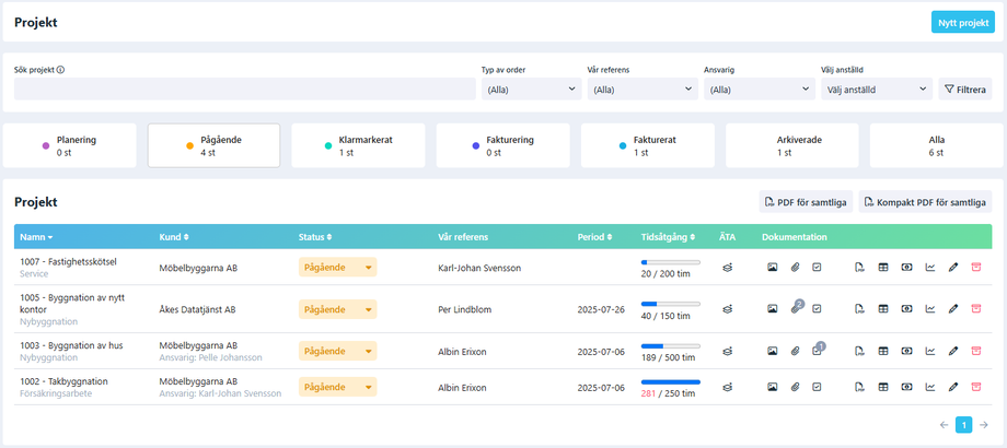 Statusboxarna hjälper dig att snabbt se vilken status ett projekt är i just nu, t.ex. Planering, Pågående eller Fakturering. Klicka på boxen för att filtrera fram projekten med just den statusen. Vid vissa tillfällen byter projekten automatiskt till en ny status, t.ex. från planering till pågående när en kostnad bokas mot projektet. Men du kan alltid byta status manuellt för att ha full kontroll på vilken fas projektet befinner sig i.