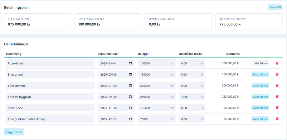 Med en löpande betalningsplan får du full kontroll över när lyft ska faktureras, utan att du behöver hålla reda på datumen själv. Systemet påminner dig automatiskt när det är dags att fakturera nästa del – direkt på startsidan!