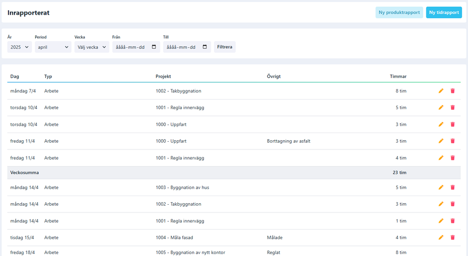 Här kan du snabbt få en överblick på all tid du har rapporterat under en vald period. Perfekt för att dubbelkolla att allt stämmer innan lönekörning eller fakturering!